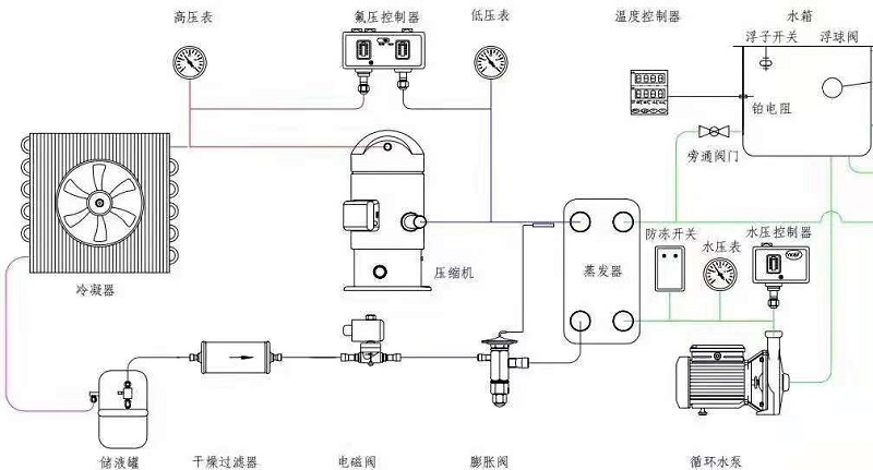 根據制冷系統原理,低溫低壓的液態冷媒在蒸發器里面與周圍水進行熱交換蒸發器吸收水的熱量,蒸發成低溫低壓的氣態,蒸發過程中冷媒溫度不變,低溫低壓氣態的冷媒進入到壓縮機,經壓縮機壓縮,被壓縮成高溫高壓的氣態,然后進入冷凝器,在冷凝器里與室內的介質進行熱交換,高溫高壓的氣態的部份熱量被介質吸收,介質溫度升高,冷媒放熱冷凝器變成高溫高壓液態,冷凝器過程溫度不變,然后進入膨脹閥進行節流,節流是迅速降溫的過程,冷媒變成低溫低壓的液態,此過程后的冷媒再進入到蒸發器進行換熱蒸發,從而實現制冷系統的整個過程,這種循環是連續進行的,水才得以連續不斷的制冷。