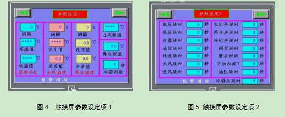 參數(shù)設(shè)定包括:觸摸屏參數(shù)設(shè)定及電氣元件參數(shù)設(shè)定。觸摸屏參數(shù)設(shè)定項(xiàng)如圖 4、圖 5 所示。電氣元件參數(shù)設(shè)定項(xiàng)主要包括壓縮機(jī)排氣超溫報(bào)警值,噴液溫度值,主加熱超溫值、再生加熱超溫值,壓縮機(jī)吸氣低壓報(bào)警值,壓縮機(jī)排氣高壓報(bào)警值,主風(fēng)道無風(fēng)報(bào)警值, 主風(fēng)道超壓報(bào)警,冷凝風(fēng)機(jī)過載,主風(fēng)機(jī)過載,壓縮機(jī)過載等