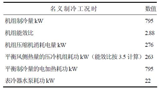 該測試系統(tǒng)在測試時(shí),運(yùn)用表冷器能夠使得冷熱量自平衡,最大限度地利用風(fēng)冷冷(熱)水機(jī)組使用側(cè)的冷量與熱源側(cè)的熱量交換,熱源側(cè)的熱量被使用側(cè)的冷量平衡后剩余的只有壓縮機(jī)的功率這部分熱量需要通過冷卻設(shè)備散去,并不需要消耗大量的能量來單獨(dú)平衡使用側(cè)產(chǎn)生的冷量和熱源側(cè)產(chǎn)生的熱量。而且風(fēng)冷冷(熱)水機(jī)組的能效比越高,同等制冷量下,需要測試系統(tǒng)散去的壓縮機(jī)功率也就越少,測試系統(tǒng)也越節(jié)能。以800kW風(fēng)冷冷(熱)水機(jī)組制冷為例,表冷器的運(yùn)用對測試系統(tǒng)的耗能比較見表1。