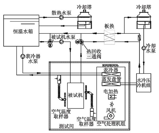 風(fēng)冷冷(熱)水機(jī)組測試系統(tǒng)依據(jù)的相關(guān)標(biāo)準(zhǔn)主要有:GB/T10870-2014《蒸氣壓縮循環(huán)冷水(熱泵)機(jī)組性能試驗(yàn)方法》、ARI550/590-2003《蒸汽壓縮循環(huán)冷水( 熱泵) 機(jī)組》、GB/T18430.1-2007《蒸汽壓縮循環(huán)冷水(熱泵)機(jī)組/工商業(yè)用及類似用途的汽壓縮循環(huán)冷水(熱泵)機(jī)組》、GB/T18430.2-2008《蒸汽壓縮循環(huán)冷水(熱泵)機(jī)組/戶用及類似用途的汽壓縮循環(huán)冷水(熱泵)機(jī)組》。上述標(biāo)準(zhǔn)中明確了測量風(fēng)冷冷(熱)水機(jī)組的主要性能指標(biāo),而測試系統(tǒng)能夠模擬標(biāo)準(zhǔn)中規(guī)定的各種工況,并能測試出風(fēng)冷冷(熱)水機(jī)組的各項(xiàng)性能指標(biāo)。研究、設(shè)計(jì)風(fēng)冷冷(熱)水機(jī)組測試系統(tǒng)也需嚴(yán)格遵照上述標(biāo)準(zhǔn)的要求。