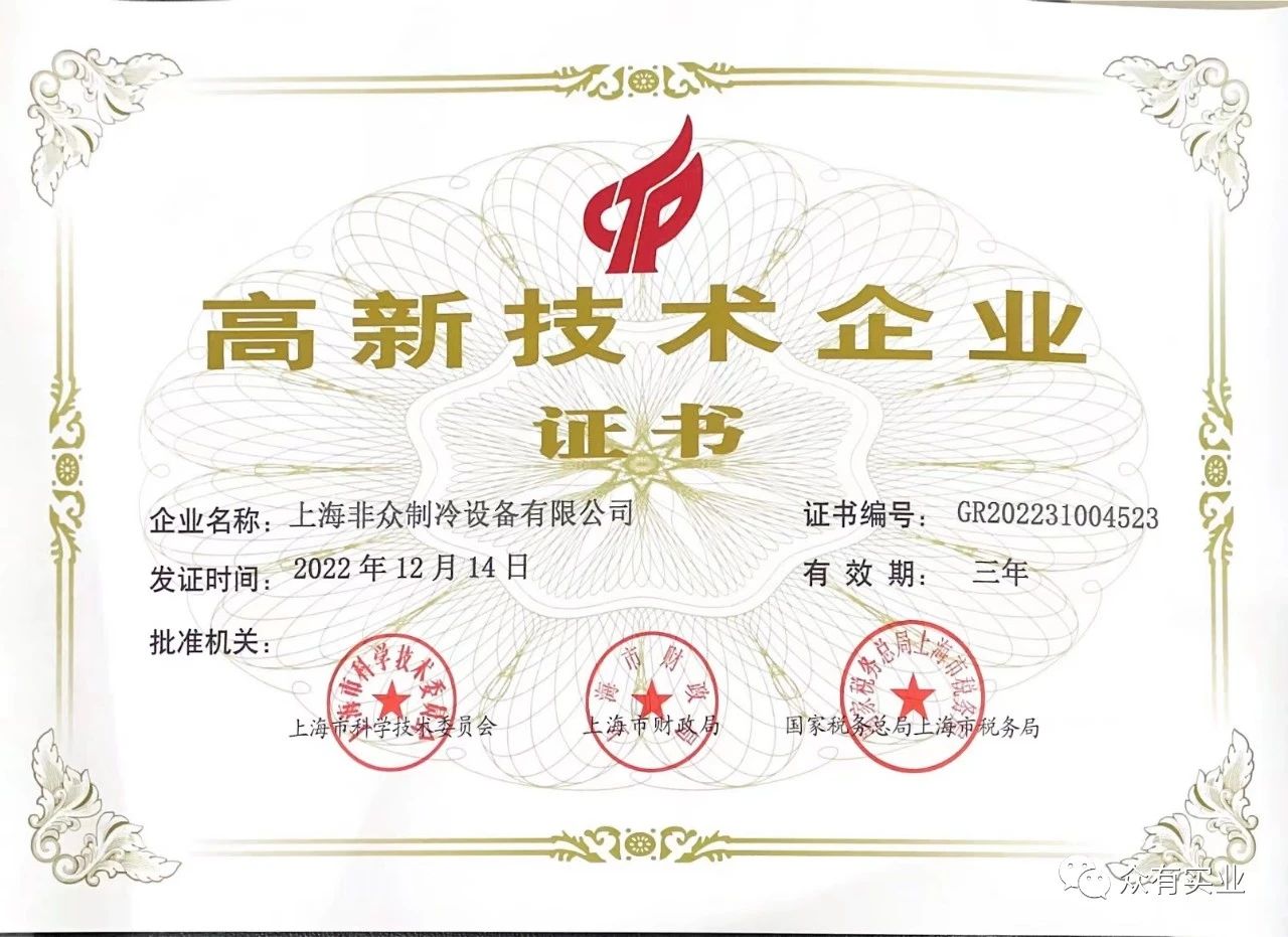 獲得高新技術企業認證,證明了非眾制冷在本領域中具有較強的技術創新能力、技術開發能力。